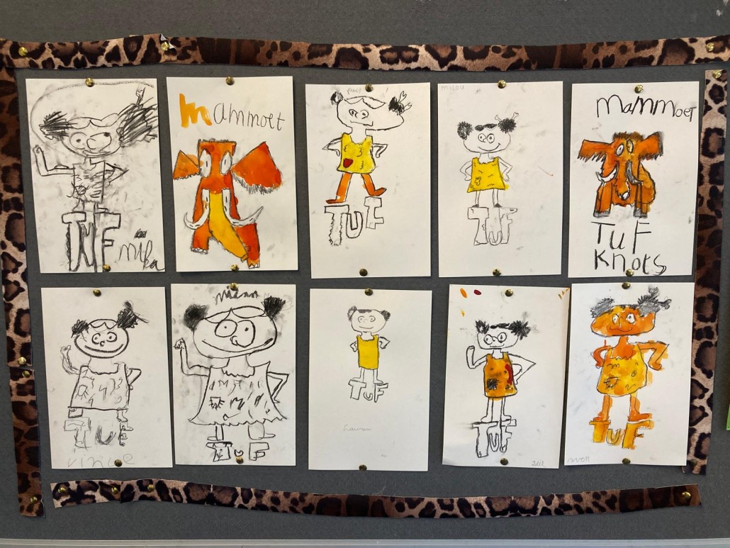 Esther had een mooie presentatie en vertelde de kinderen over de hoofdfiguren uit de boeken die ze illustreert. Het verhaal gaan over een jongetje Knots, zijn beste vriend Freddie en zijn kleine zusje Tuf. Het speelt zich af in de oertijd, is humoristisch en vol avonturen.